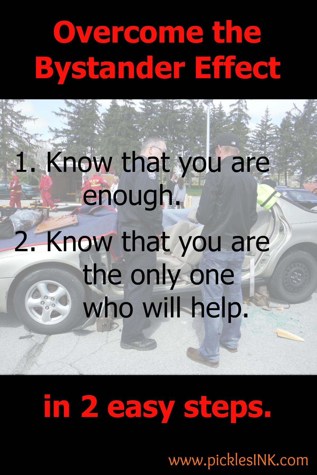 The trouble with the bystander effect is that it paralyzes everyone – so my intent with this post is to get just one person to think, “It had better be me, then,” the next time they’re faced with the situation. If people can overcome the initial, “Someone else has probably already done it/will do it,” then they can get to the next step of, “Okay, what’s safest/best/most effective way for me to help under these particular circumstances.”